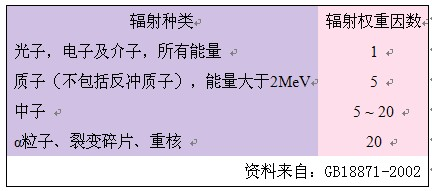 不同种类的辐射(α 、β 、γ 、中子)照射人体,虽使人体有相同的吸收剂量,但却会造成不同的伤害现象。为此,针对不同种类的辐射定出辐射权重因数(Q),代表不同辐射对人体组织造成不同程度的生物伤害,它们的值列于下表: