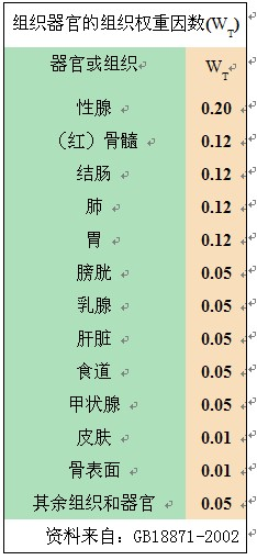 由于人体各种组织器官对辐射的敏感度不同,所以虽接受相同的当量剂量,但造成的健康损失(患癌症或不良遗传)的风险(概率)却不同,也就是说不同的组织器官,照射相同的辐射所造成的伤害不同。因此又订定出「组织权重因数」(WT)来代表各组织器官接受辐射对健康损失的概率。