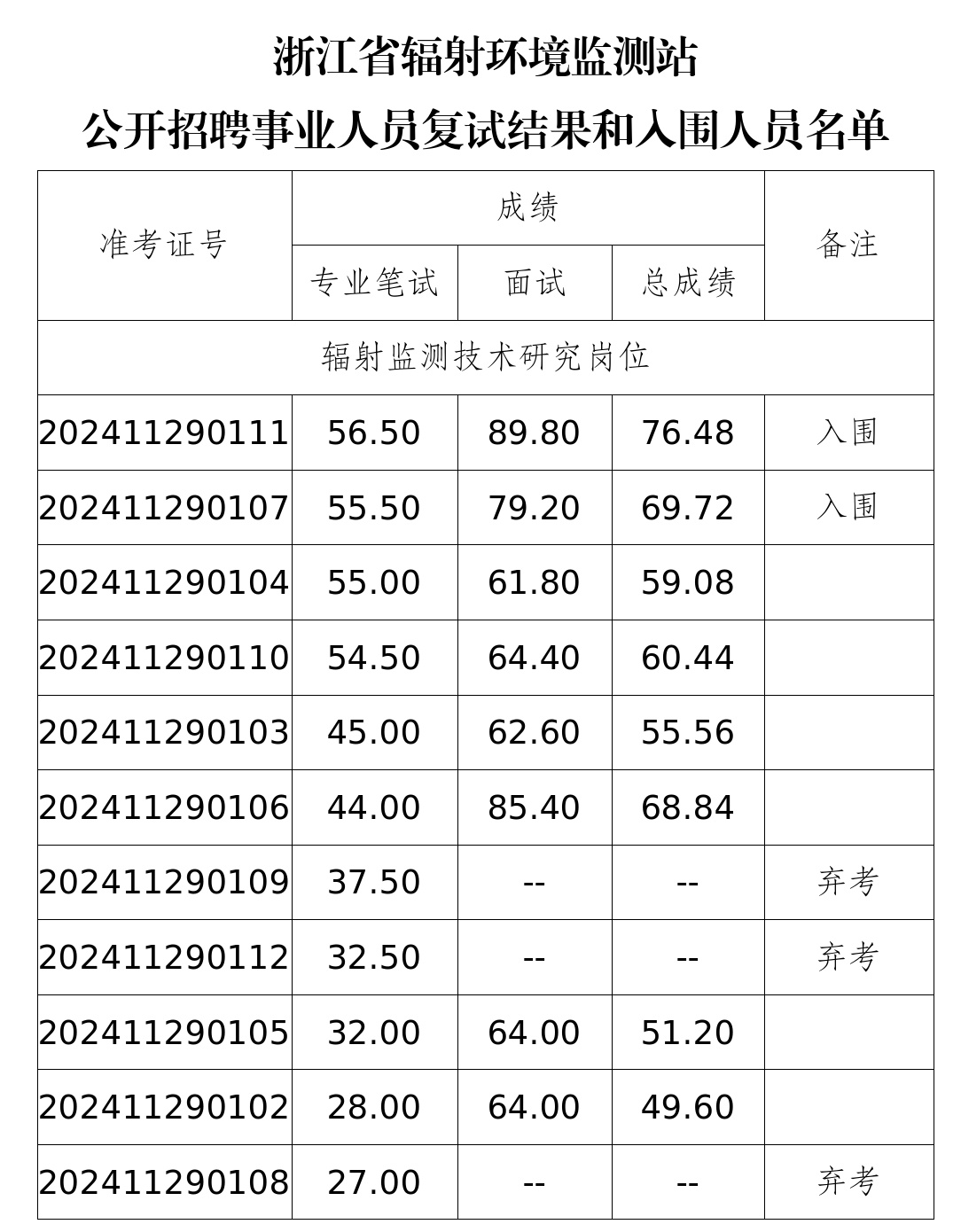 浙江省辐射环境监测站公开招聘事业人员复试结果和入围人员名单公告