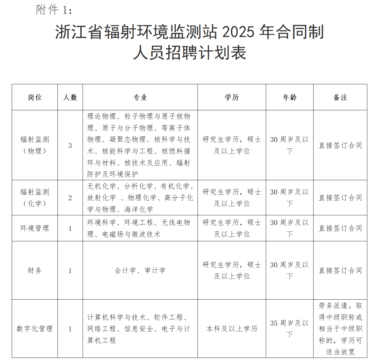 附件:1、浙江省辐射环境监测站2025年合同制人员招聘计划表
