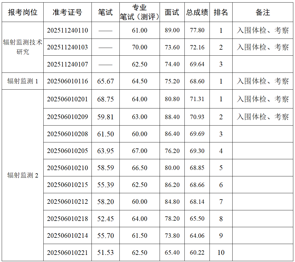 2.辐射监测技术研究岗位考生总成绩=专业笔试成绩×40%+面试成绩×60%。