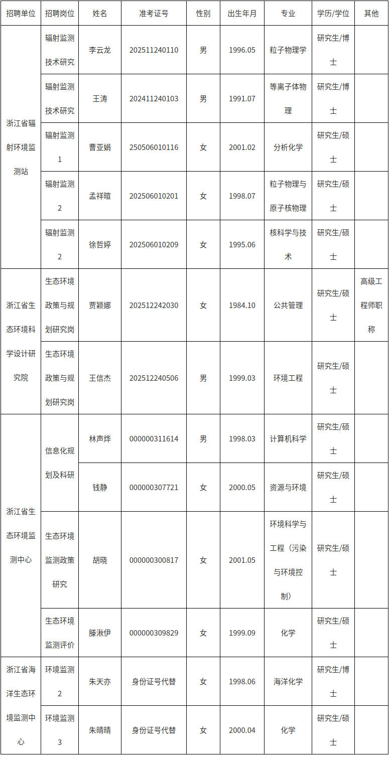 根据2025年3月18日《浙江省省属事业单位2025年上半年集中公开招聘人员公告》和4月18日《浙江省生态环境厅关于部分直属事业单位公开招聘人员的公告(2025年第二批)》,经报名、资格审查、面试、体检和考察,现确定下列人员为我单位拟聘用人员并公示如下: