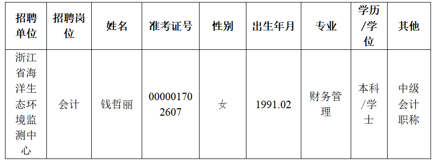 根据2025年10月27日《浙江省生态环境厅关于部分直属事业单位公开招聘人员的公告(2025年第四批)》,经报名、资格审查、考试、体检和考察,现分别确定下列人员为我厅所属部分事业单位拟聘用人员,公示如下: